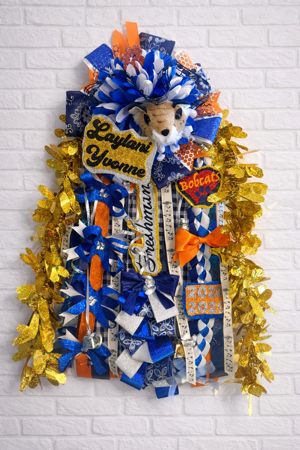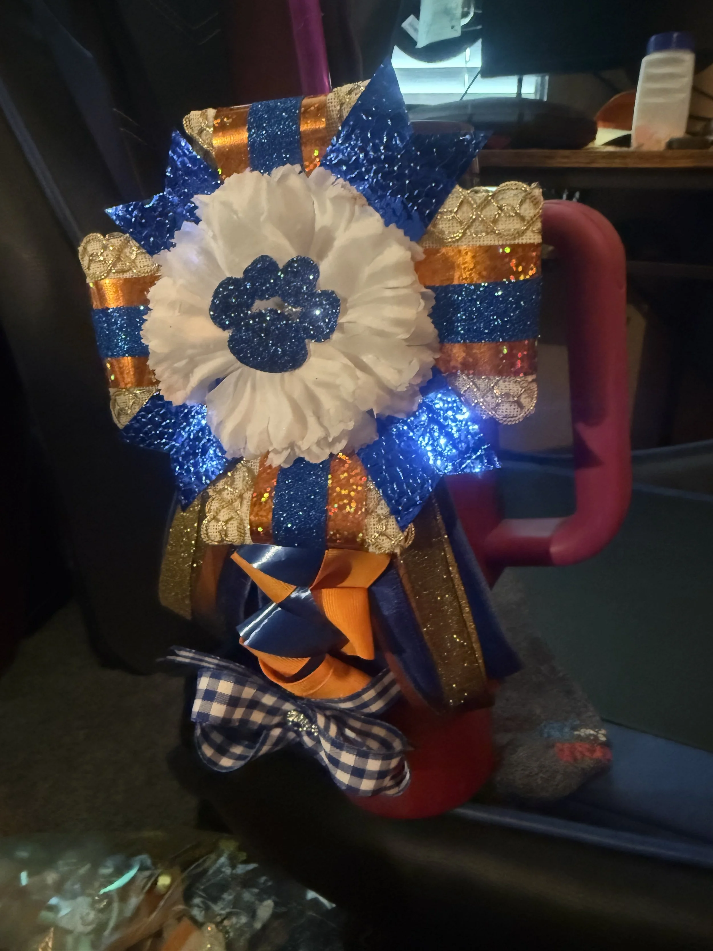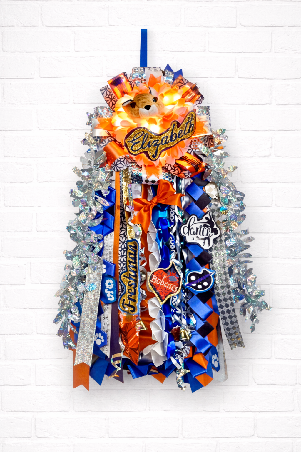 The “Deluxe Zoey” -$120 Single 7-8.5” mum flower, 36 in Ribbon, 3 bells, 3 Specialty Braids, Lights in the mum, plush, 3 custom cutouts, Feather Boa or non-feather boa, 2 name cutouts, mascot cutout)