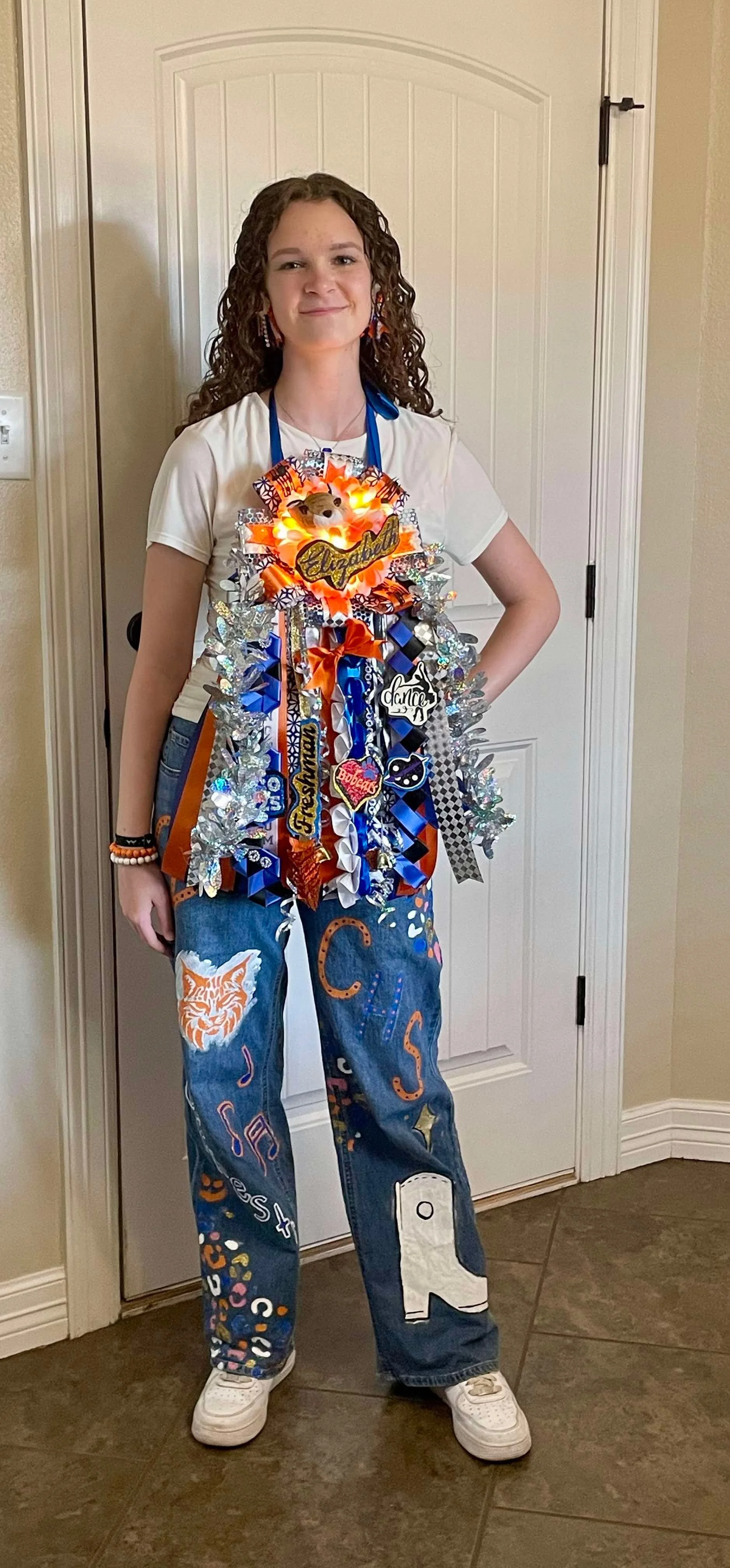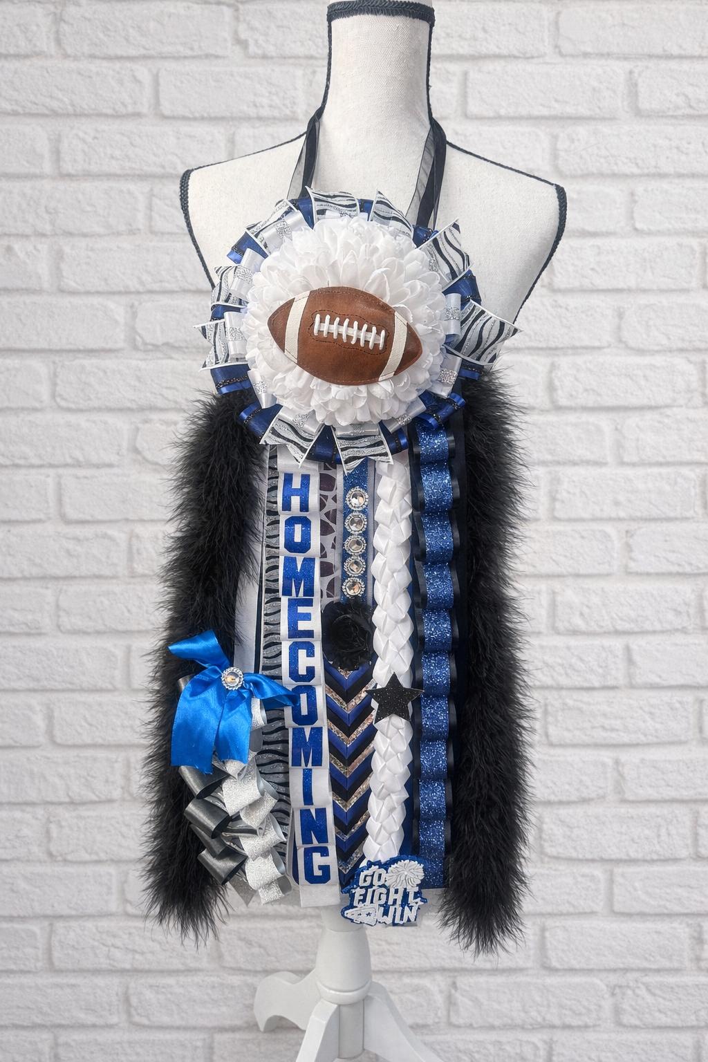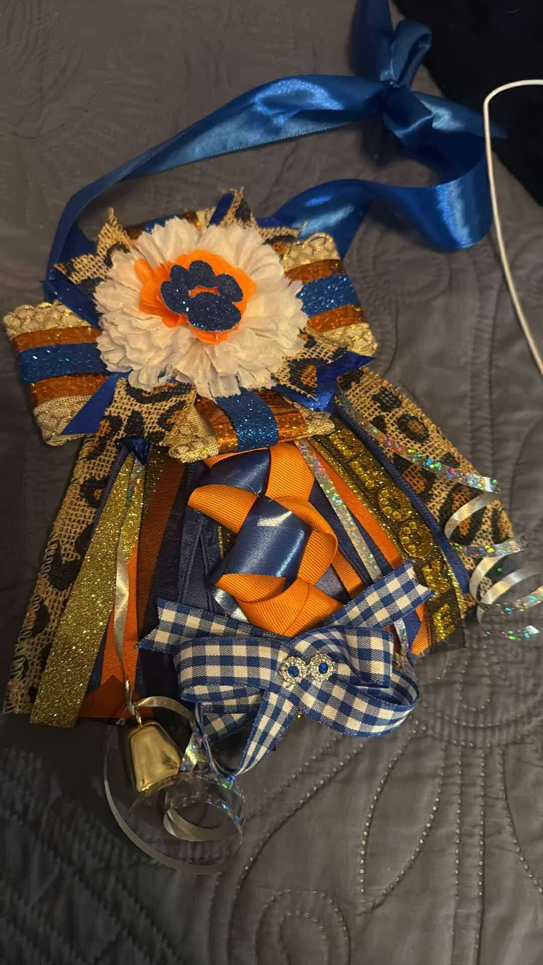 The “Deluxe Zoey” -$120 Single 7-8.5” mum flower, 36 in Ribbon, 3 bells, 3 Specialty Braids, Lights in the mum, plush, 3 custom cutouts, Feather Boa or non-feather boa, 2 name cutouts, mascot cutout)