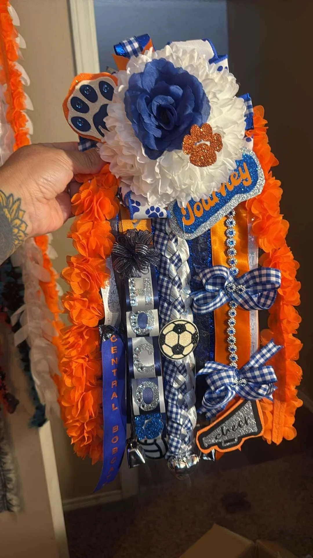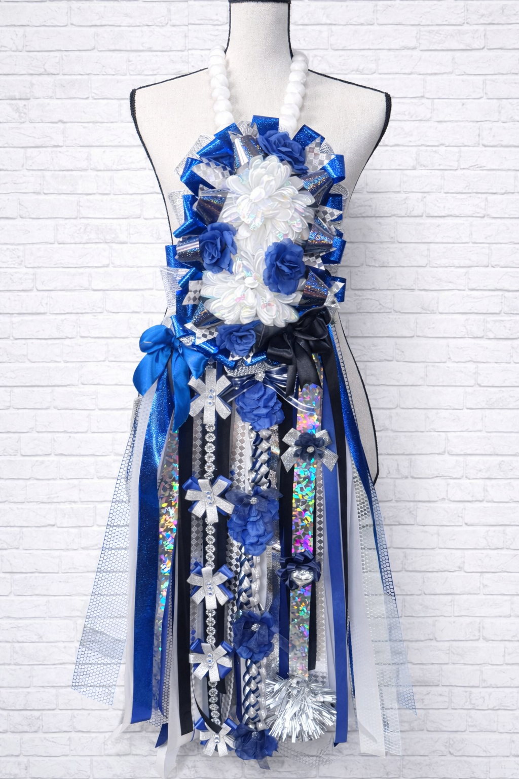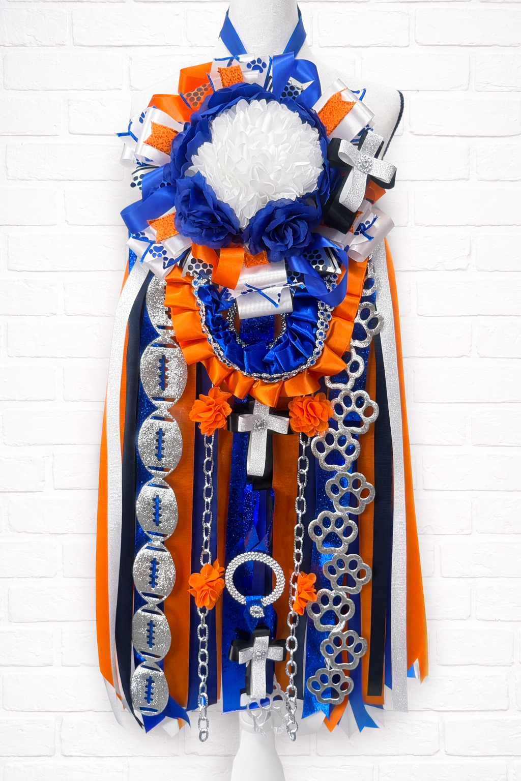 The “Zelda”-$275 Sash Mum (Sash comes across chest and stops at waist where the mum will begin: so ribbons will be roughly 18-20 in/ mum at waist (2) 7-9 in flowers. Includes 4 specialty braids and extra mum flowers across the sash (3-4 in flowers), 4 custom cutouts, Feather Boa or non-feather boa, up to 2 name cutouts , mascot cutout, "Class of __" for flowers on sash, 4 bells, plush, and lights in the sash and/or mum head.