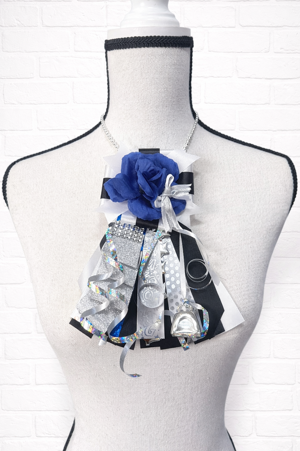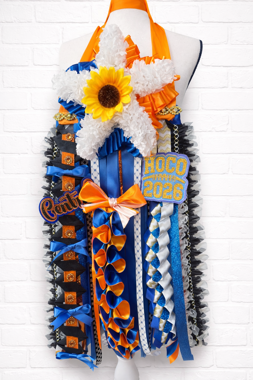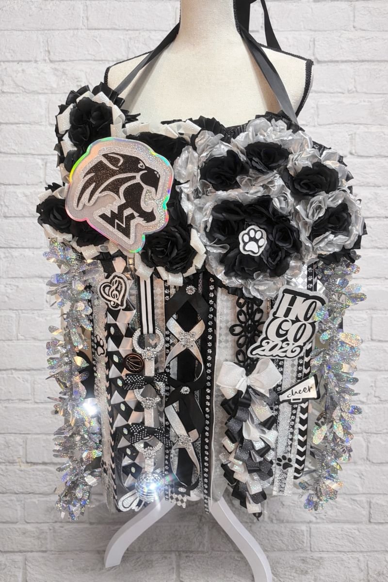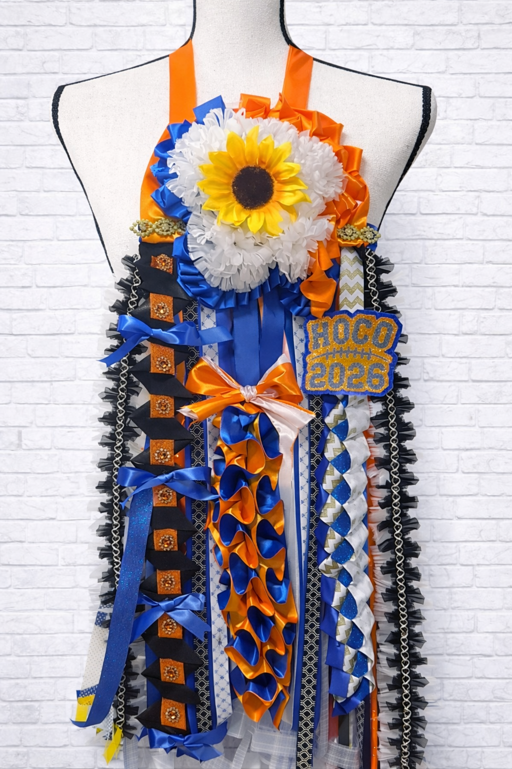 The “Zelda”-$275 Sash Mum (Sash comes across chest and stops at waist where the mum will begin: so ribbons will be roughly 18-20 in/ mum at waist (2) 7-9 in flowers. Includes 4 specialty braids and extra mum flowers across the sash (3-4 in flowers), 4 custom cutouts, Feather Boa or non-feather boa, up to 2 name cutouts , mascot cutout, "Class of __" for flowers on sash, 4 bells, plush, and lights in the sash and/or mum head.