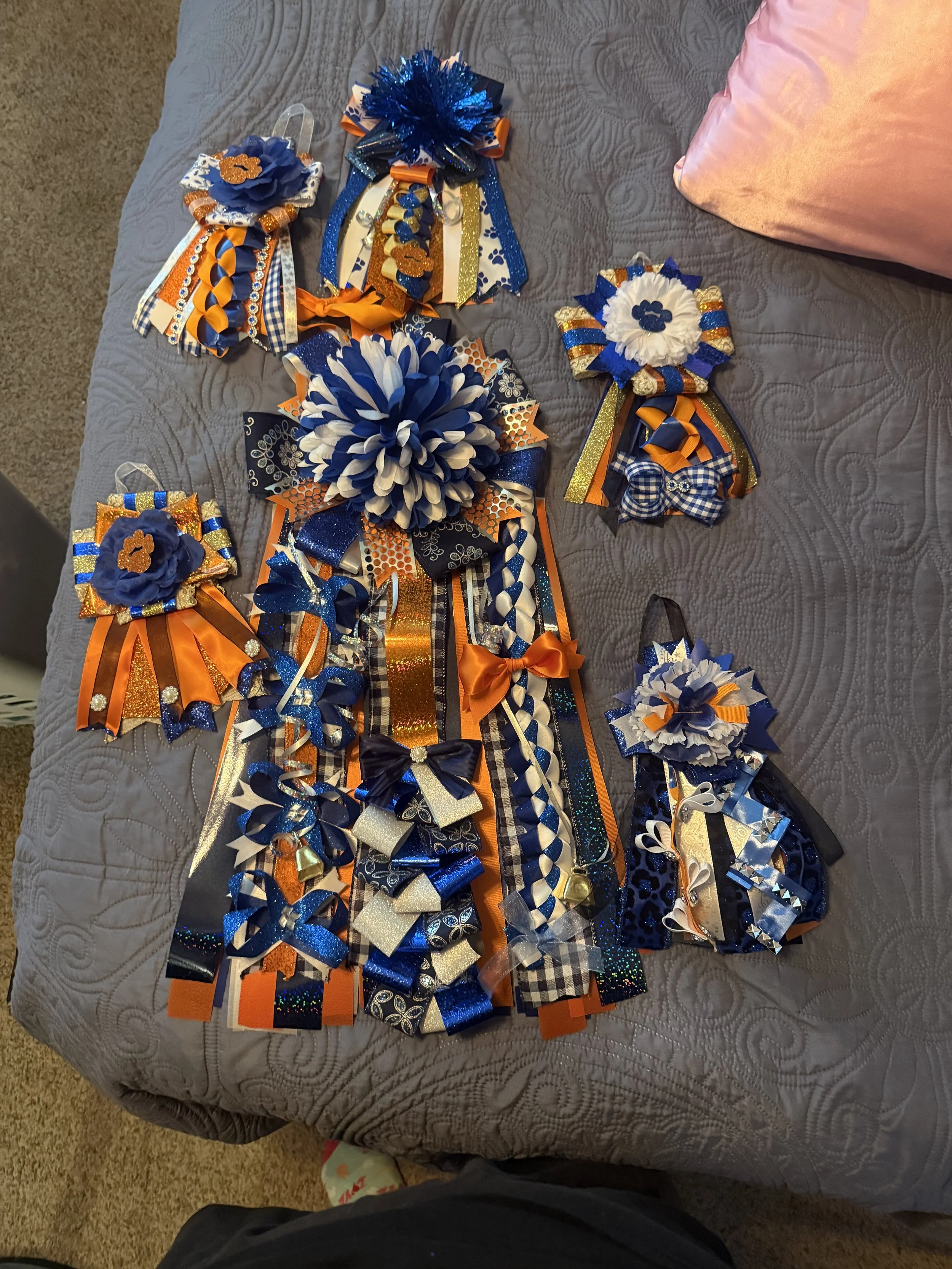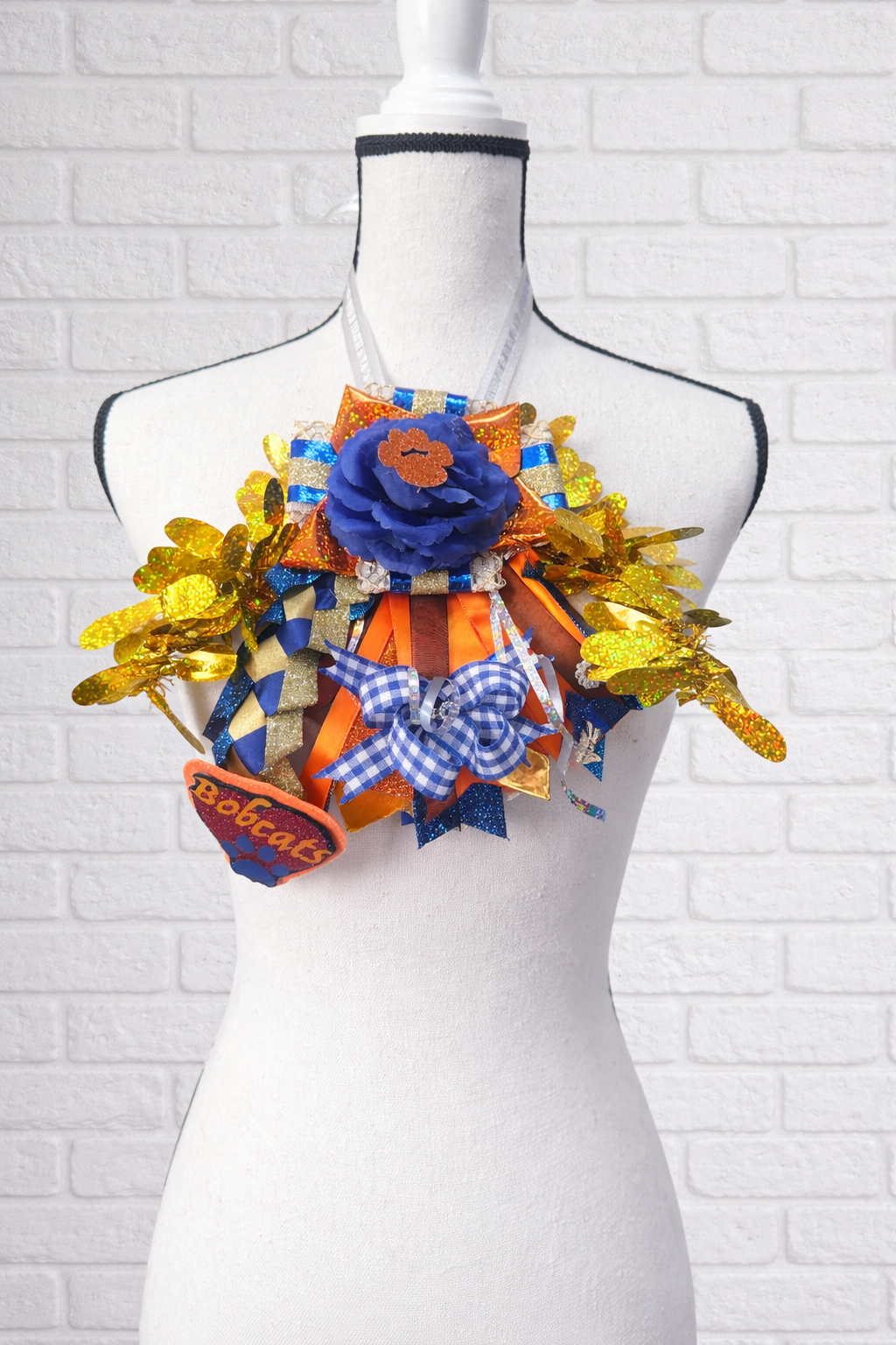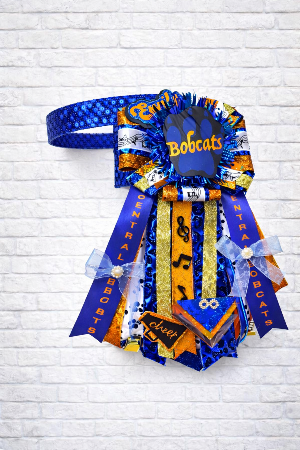 Single Mum 5.5-6" flower, up to 22" Ribbons, Includes 2 bells, 2 specialty Braids, 2 custom cutouts, Feather Boa or non-feather boa, 2 name cutouts, mascot cutout. This one was super cool as a belt mum and with a plush add-on!