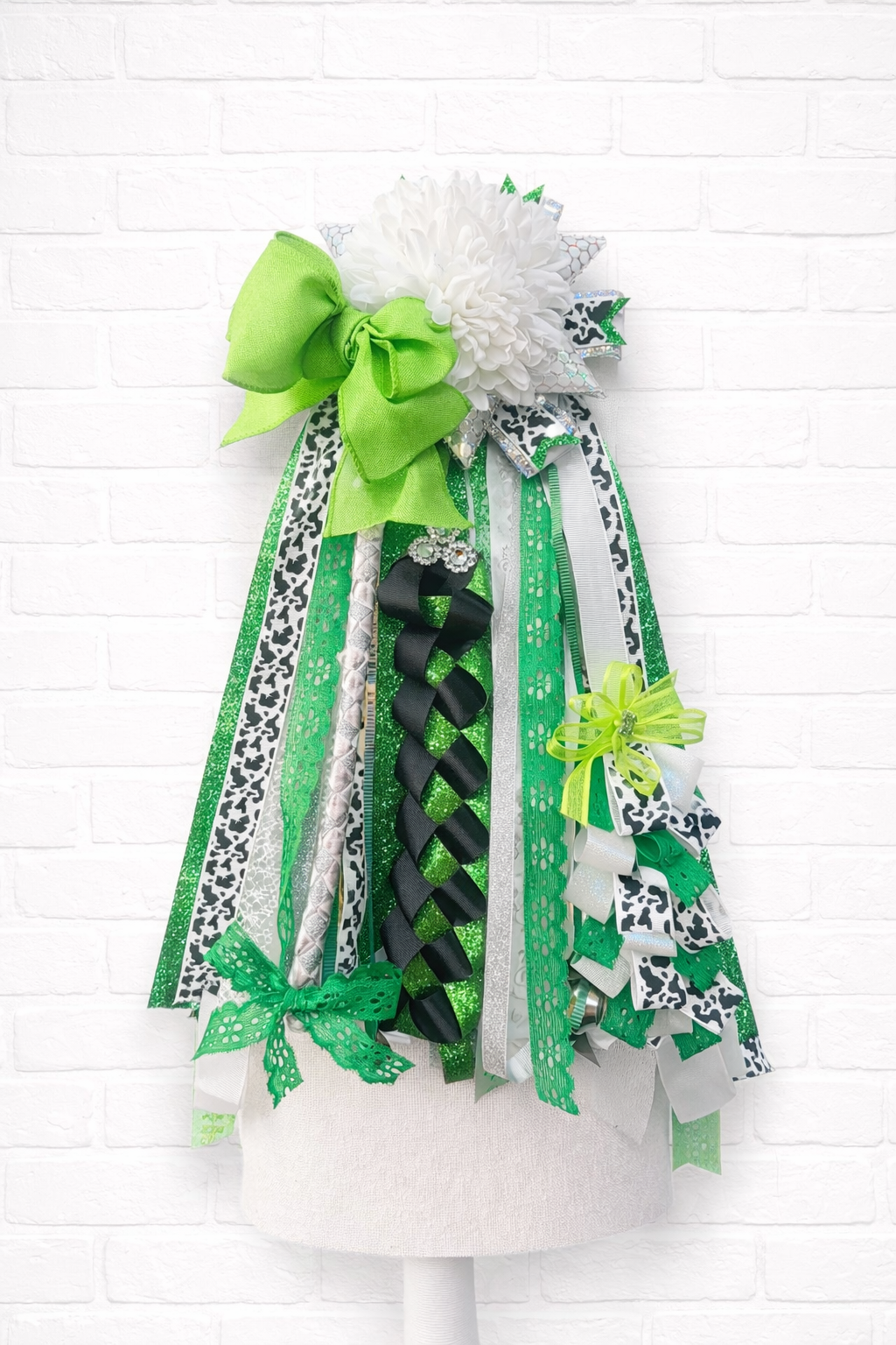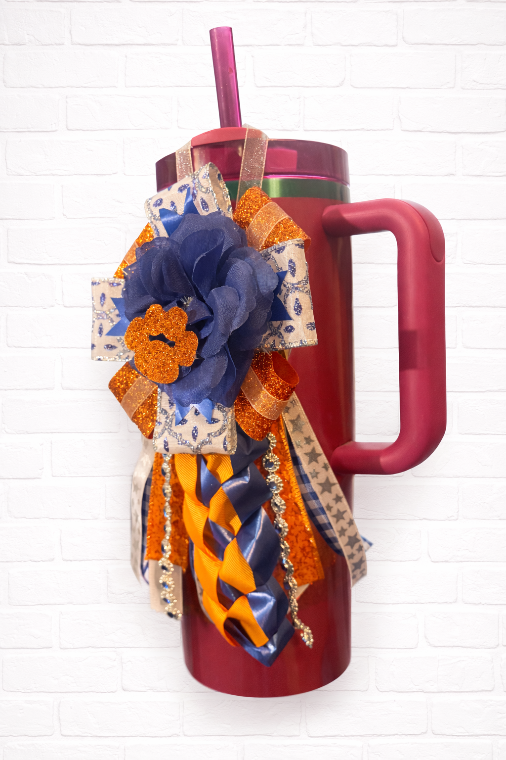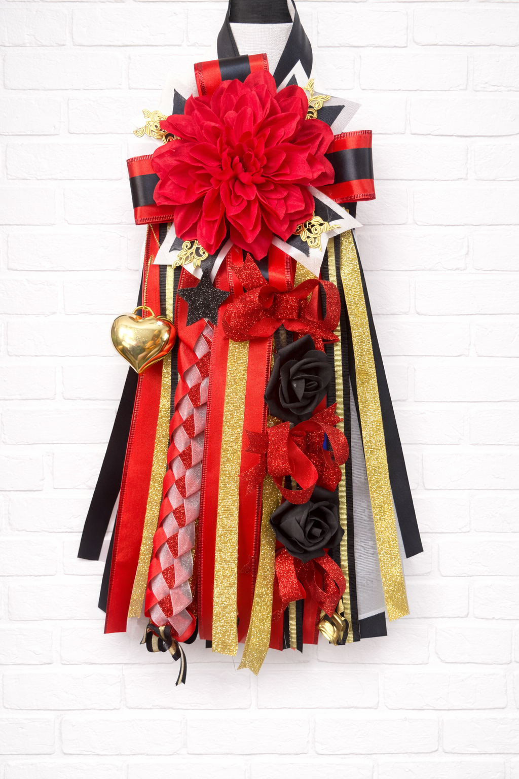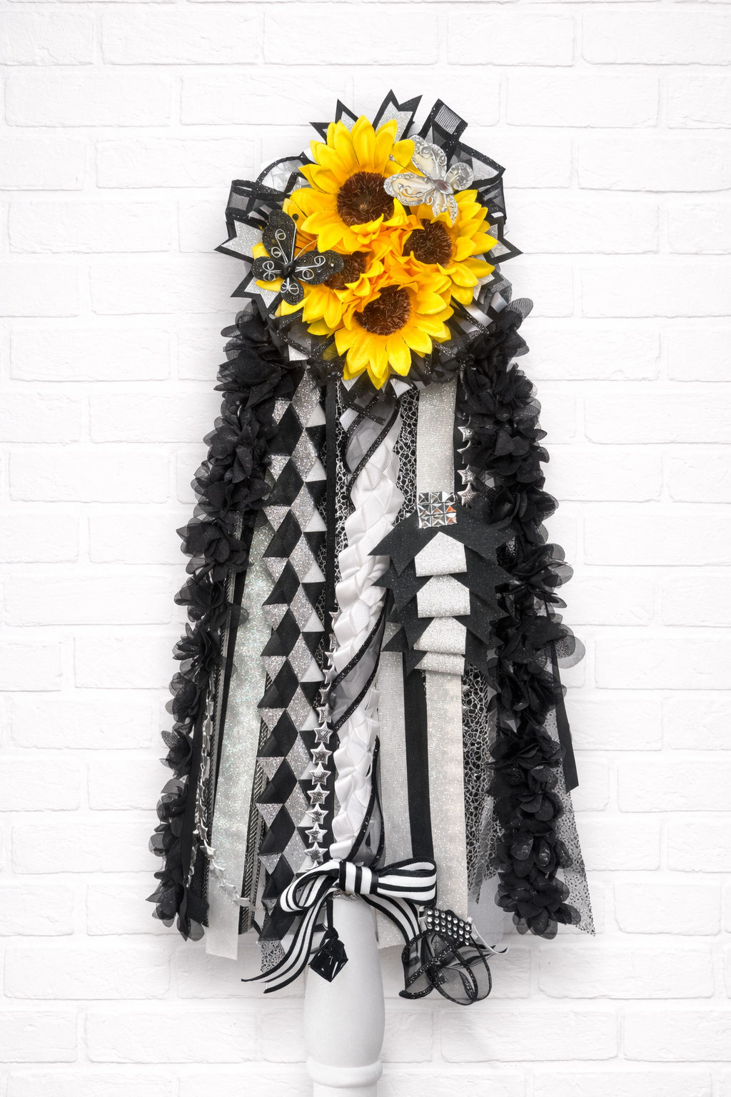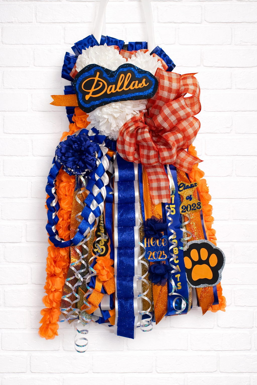 The Zuri- $150 Double Mum- 36 in Ribbons/ (2)- 6" flowers and 2 small accent flowers, 3 specialty braids, 3 custom cutouts, Feather Boa or non-feather boa, up to 2 name cutouts, mascot cutout, lights
