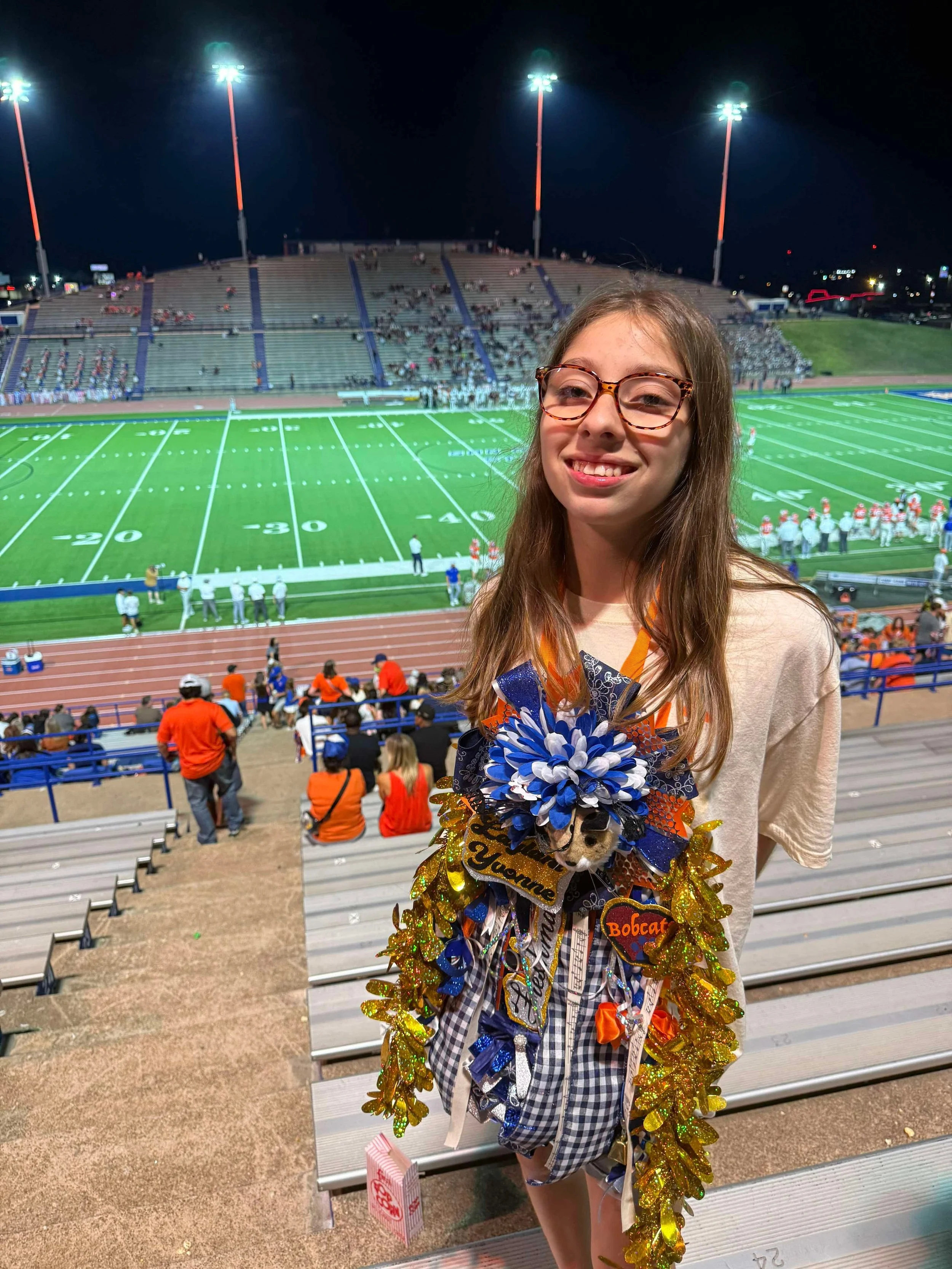She really steals the show! A combination of two shapes (in this picture a Texas and a paw- or maybe you'd like one large shape like a megaphone- you get to pick! She comes with 4 custom cutouts, 3 bells, Lighted name or mascot, 4 specialty braids!