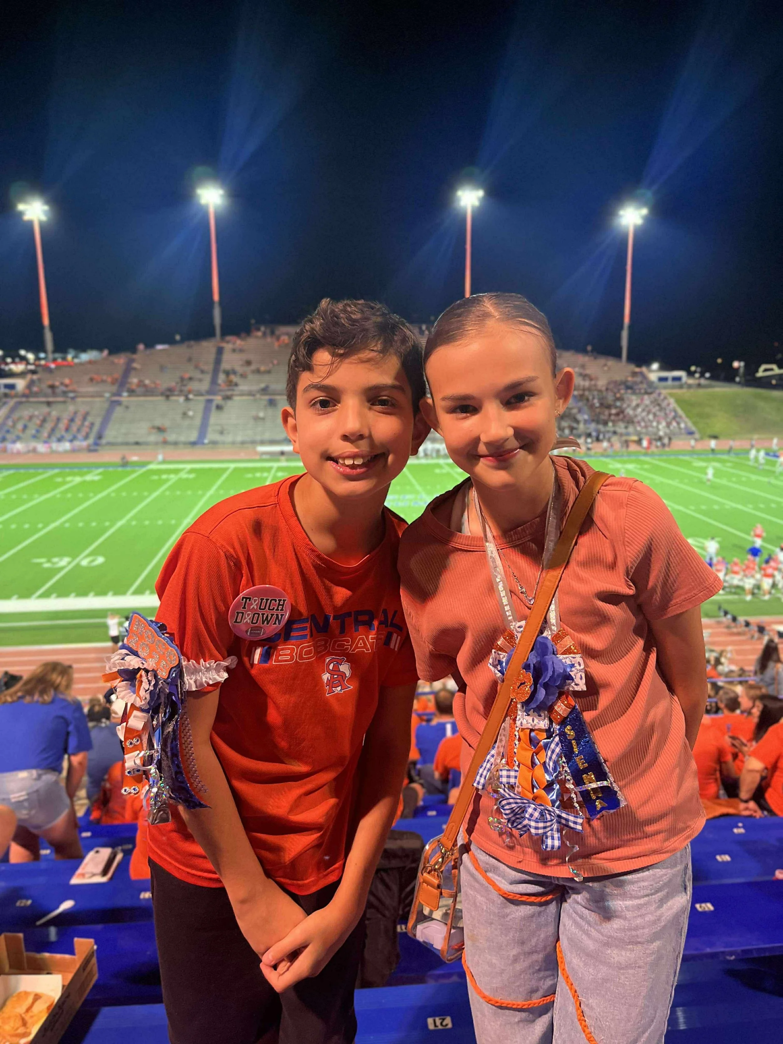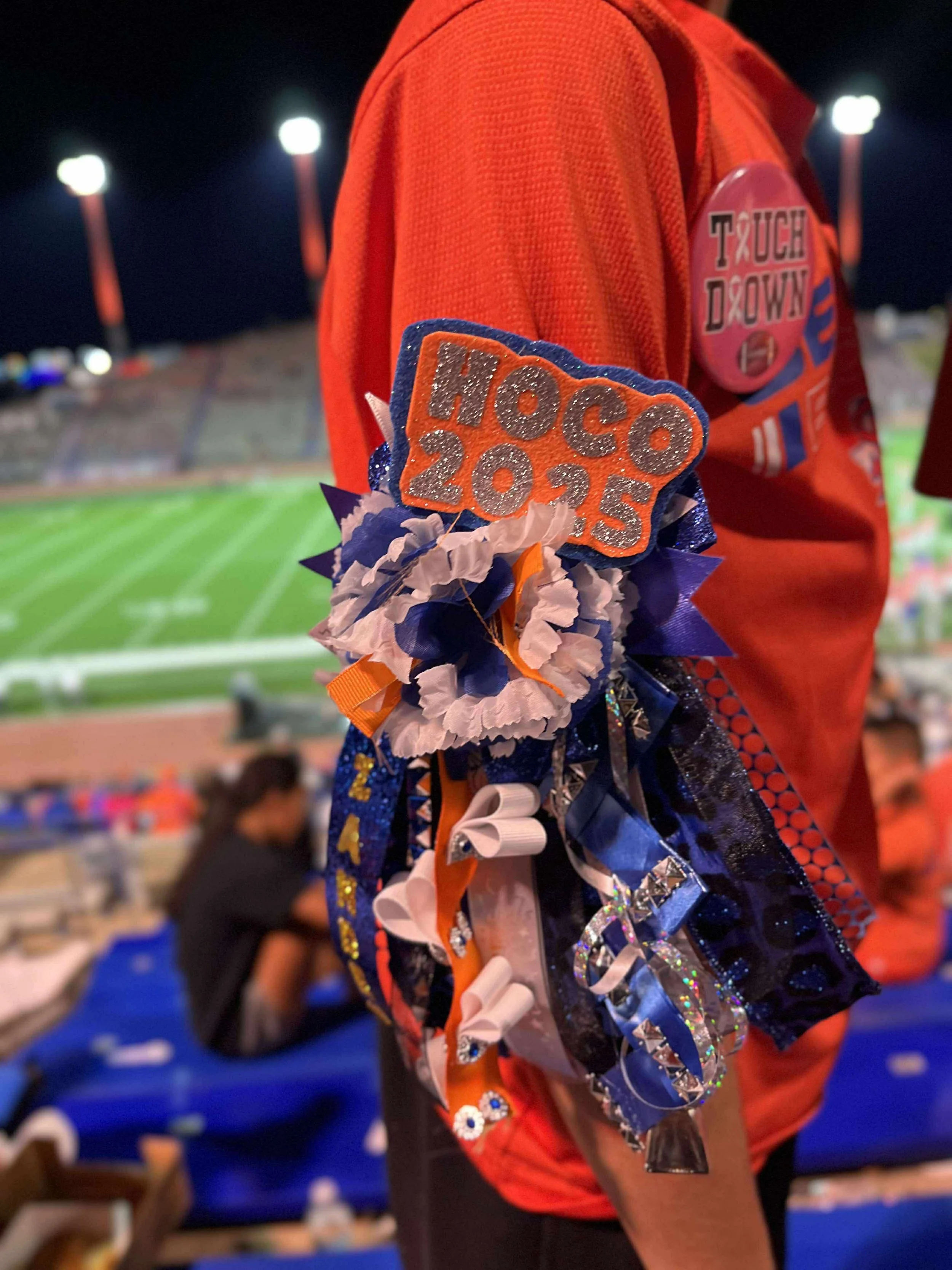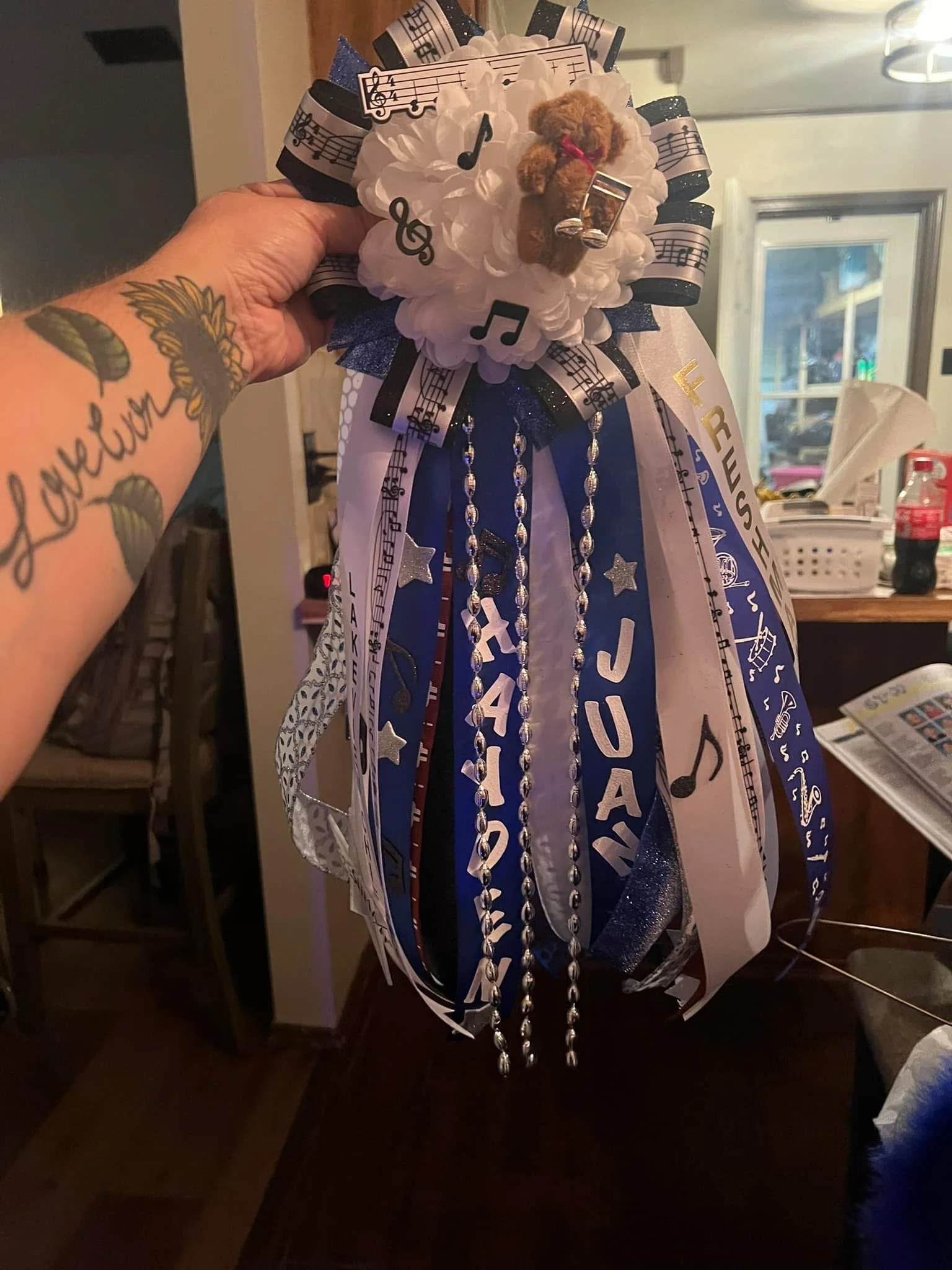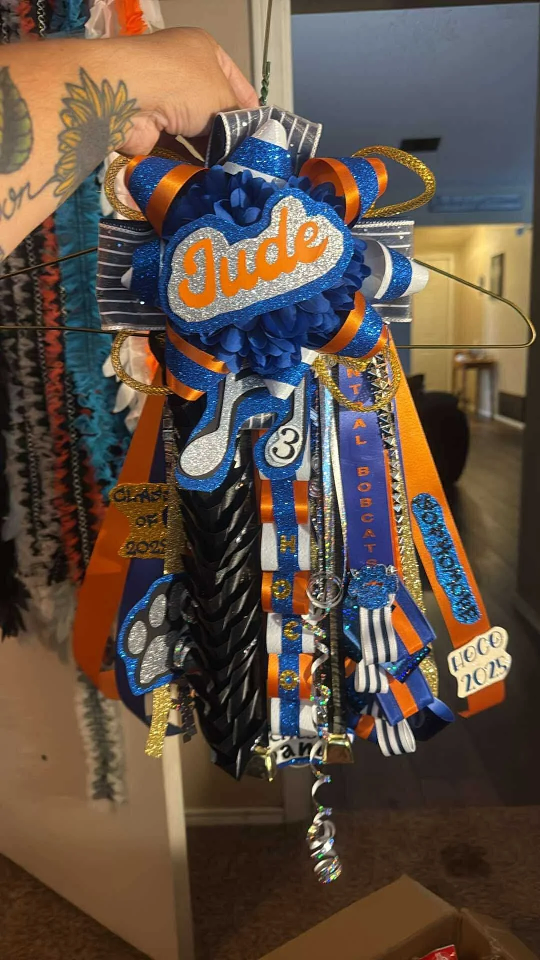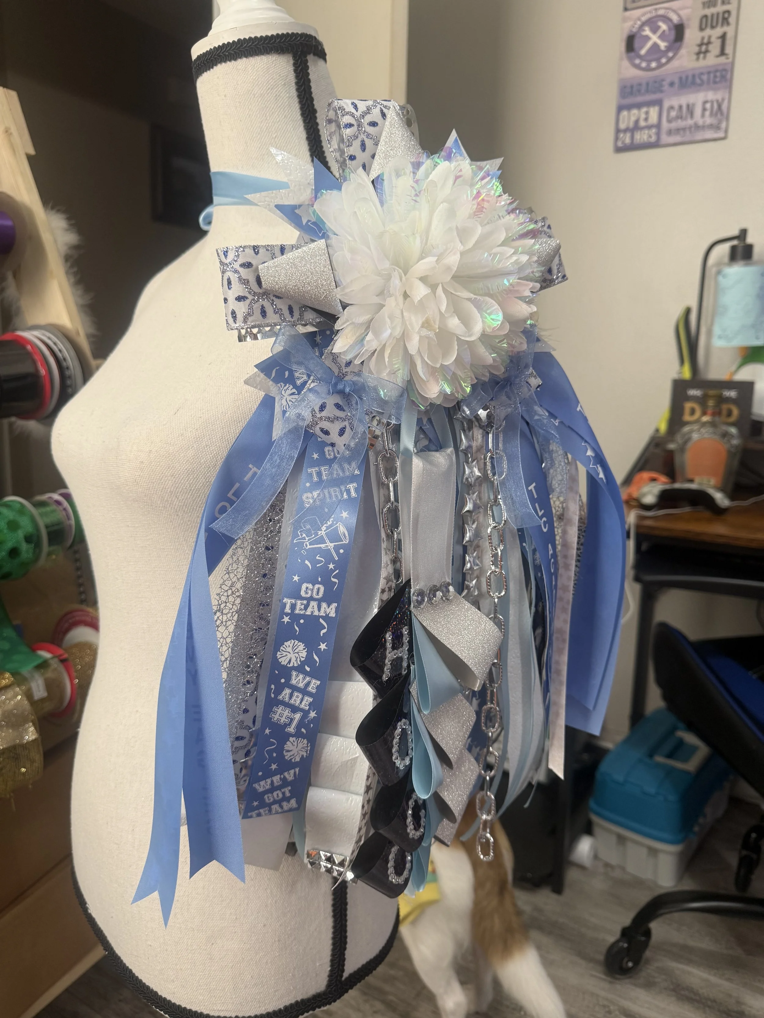 Great for high school aged fellas. 5-6 in flower, 12-15 in ribbons-includes 3 specialty braids, 3 bells, 3 custom activity/mascot cutouts, up to 2 name cutout, lights