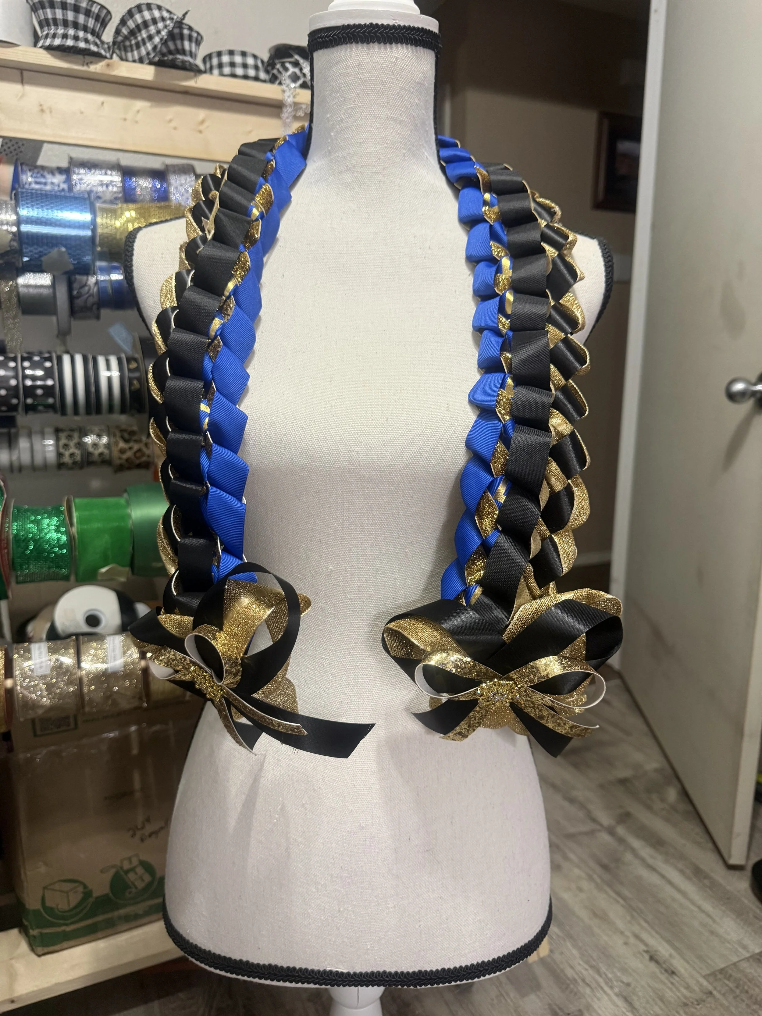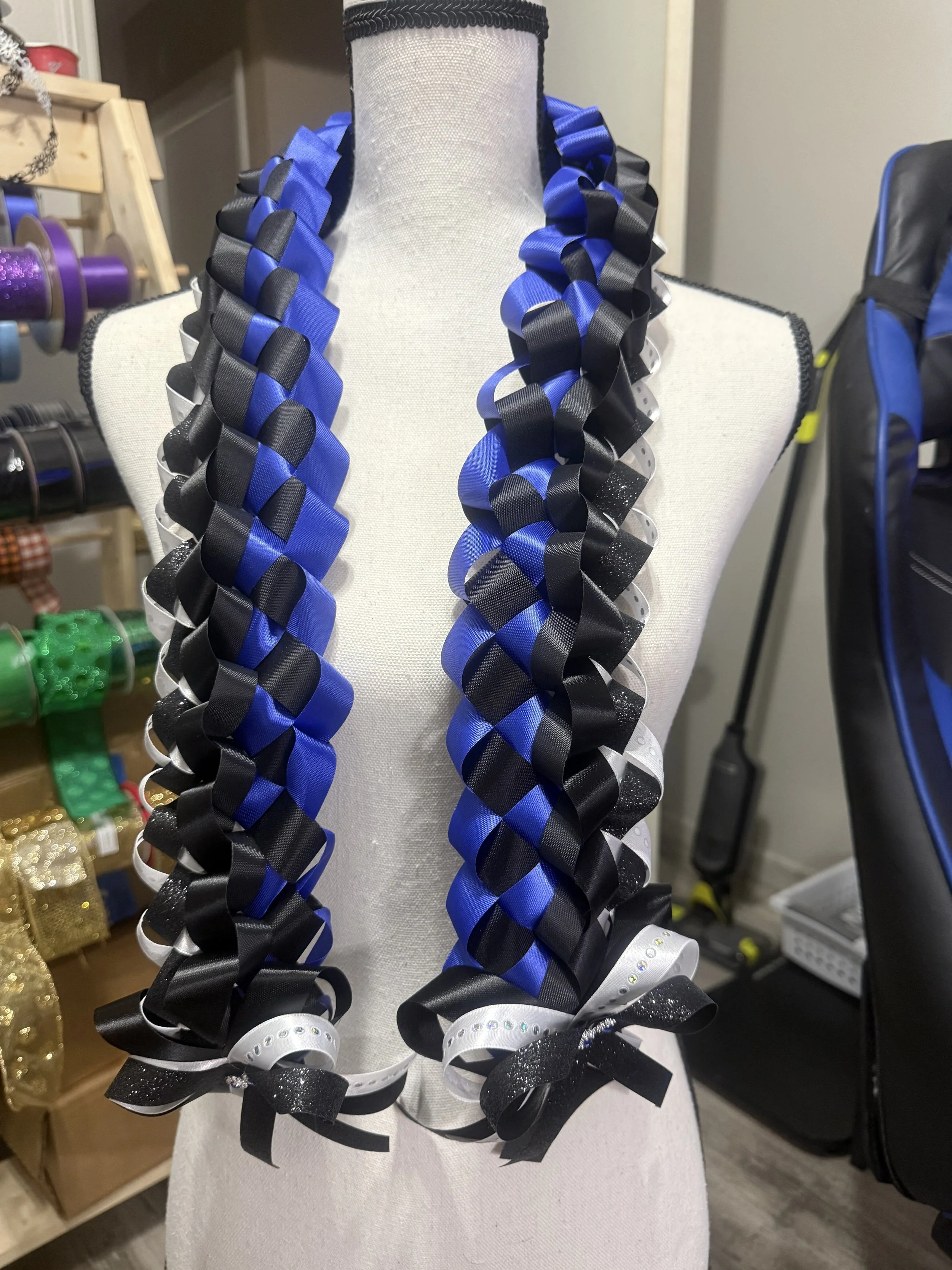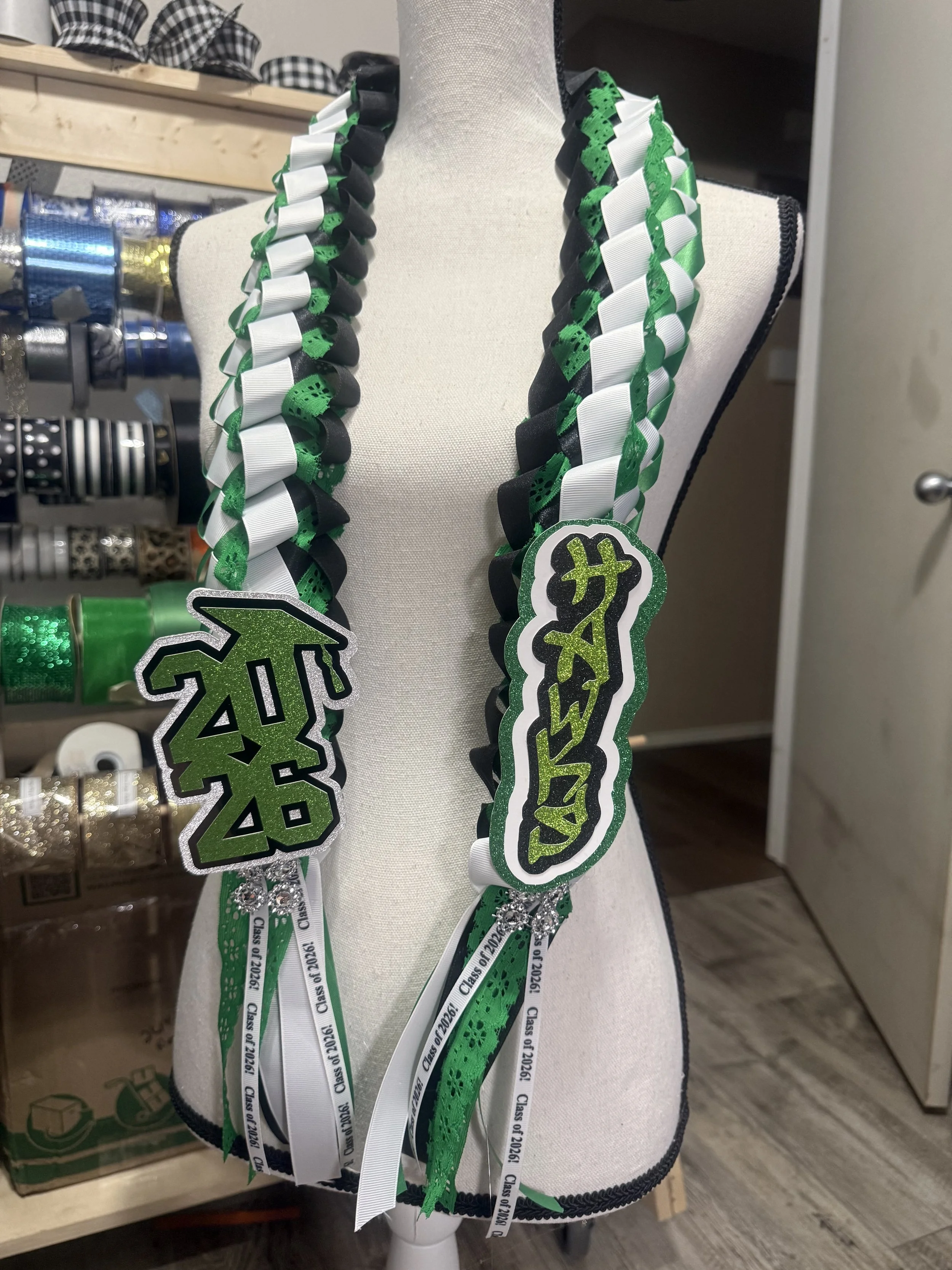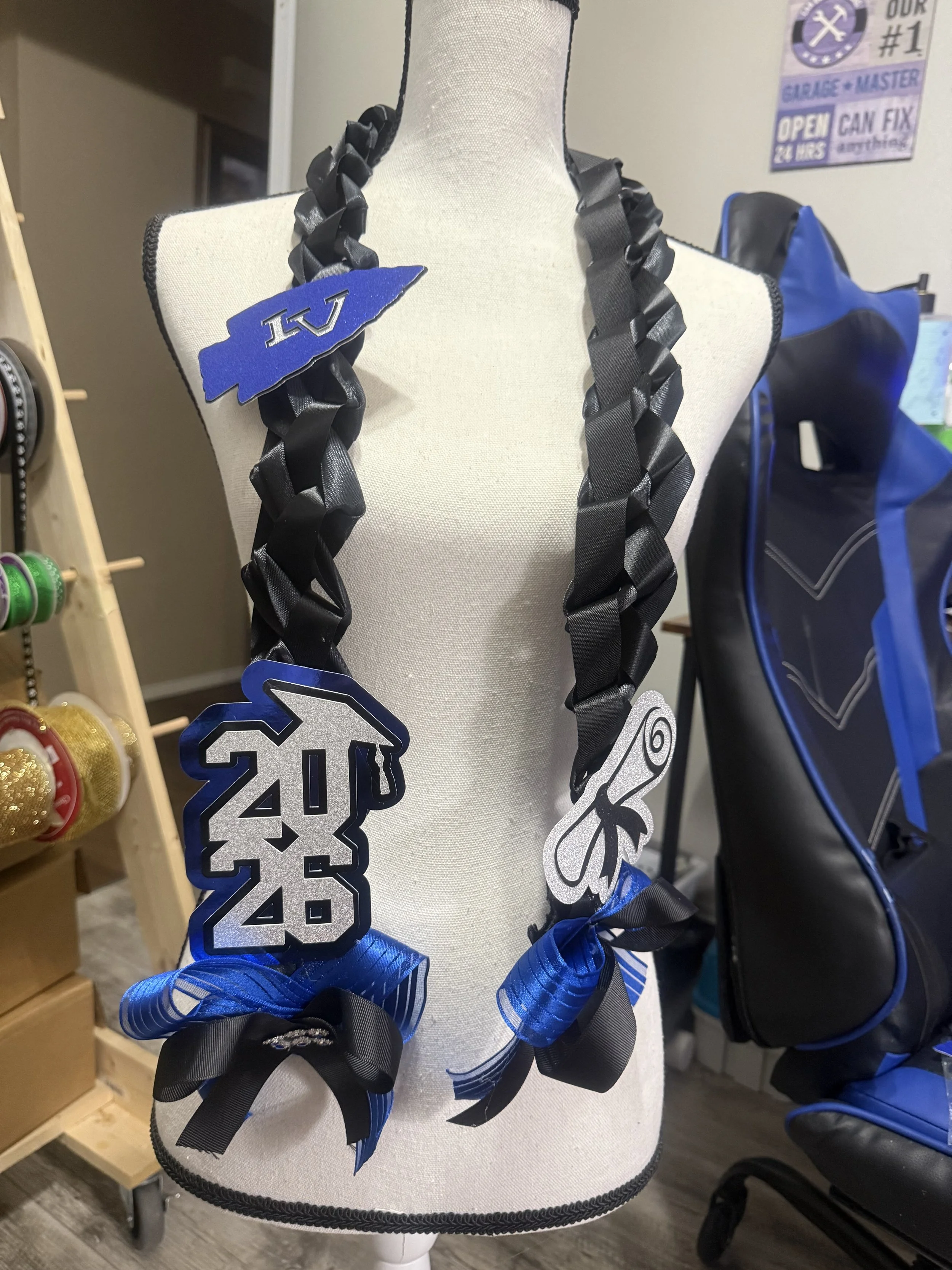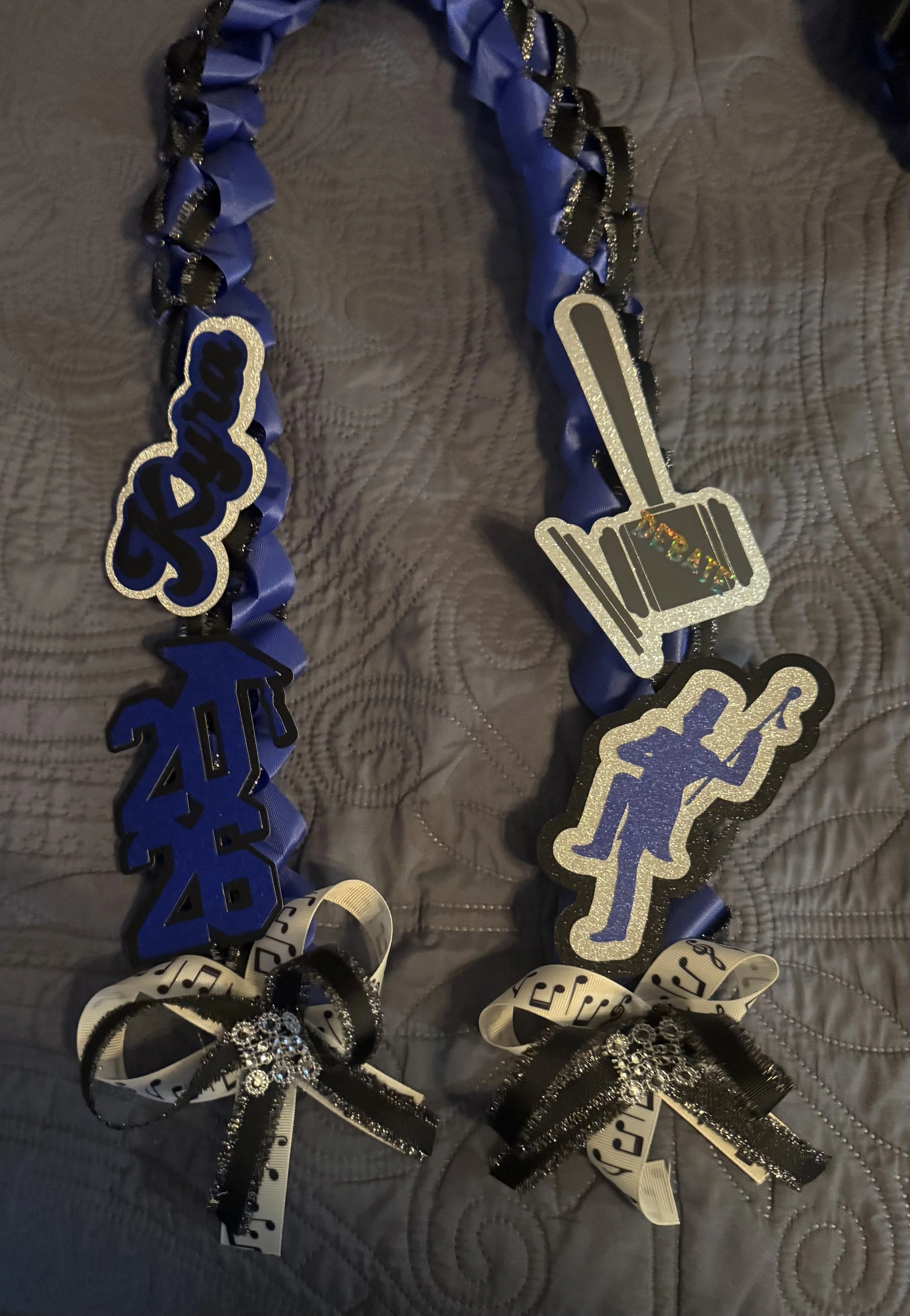 Senior Leiz are an exquisite way to honor your high school or college grad! Available in Single and Double military braid, I will then add custom cutouts to showcase achievements, future plans, or any unique designs you’d like! I’ve even seen some done in complete themes of favorite childhood movies. Base price includes Braid, Bling accents, 2 cutouts on Single/ 3 on Double. Add more cutouts for $2 per cutout!