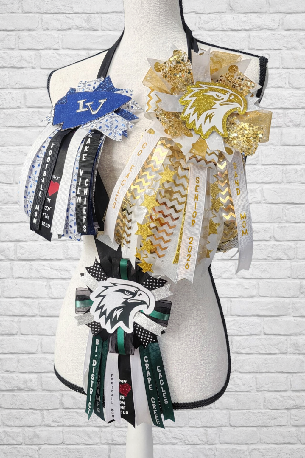 Both include sport/activity name/student name/ team name /instruments/specialty message such as "My Heart is on the Field"